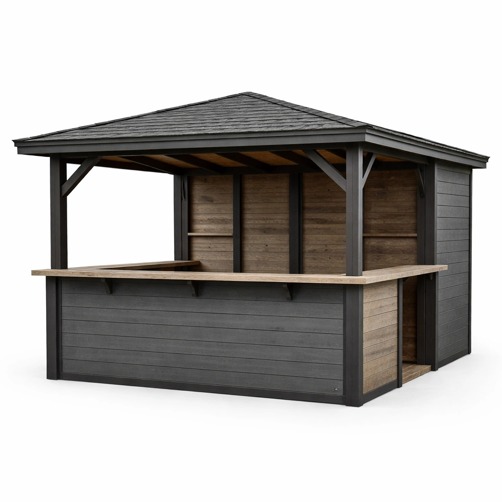 Bar de jardín de madera compuesta gris marrón con techo a dos aguas