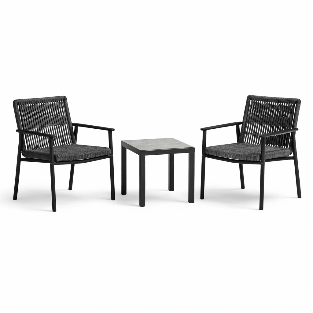 Conjunto de descanso de aluminio y teca gris negro con sillas y mesa