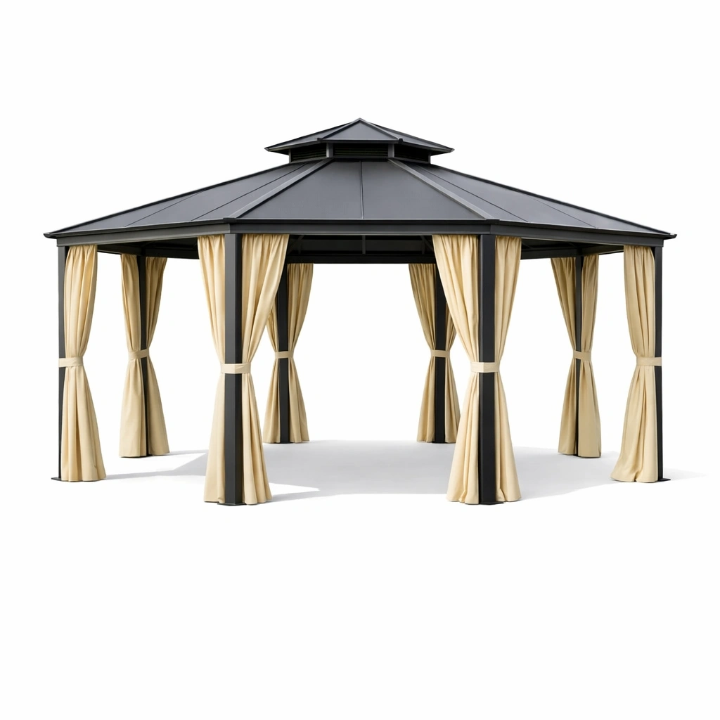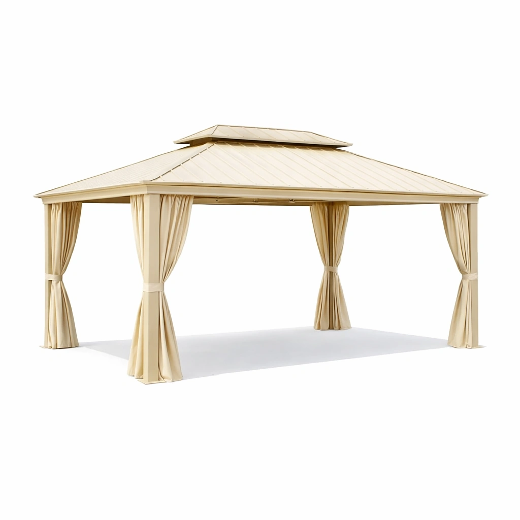 Gazebo de aluminio con techo de acero galvanizado y cortinas de poliéster beige