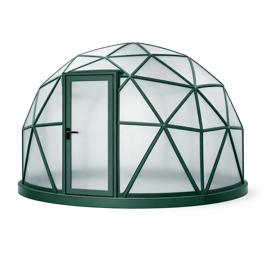 La cúpula geodésica está fabricada con policarbonato de 6 mm y un marco de aleación de aluminio con recubrimiento en polvo. Tiene un diámetro de 3.6 m y una altura de 2.2 m, abarcando un área de 10.2 m². Su diseño geodésico y su tono verde la hacen adecuada para diversos ambientes exteriores. Se instala mediante un montaje simple, lo cual toma aproximadamente 2 horas. No se recomienda su uso en climas extremos sin refuerzos adicionales.